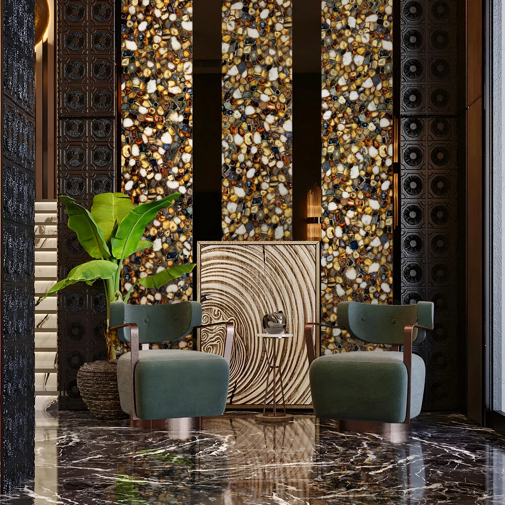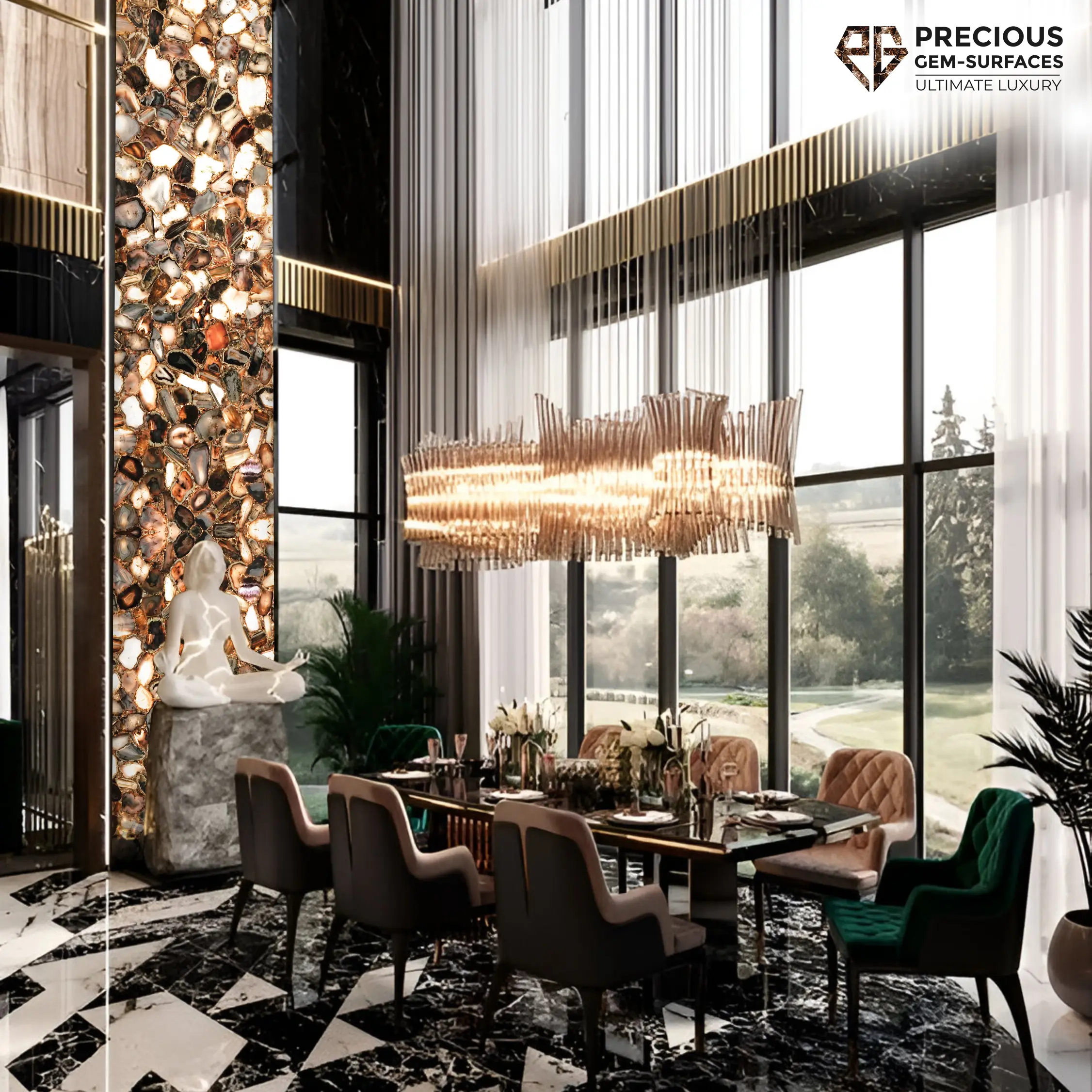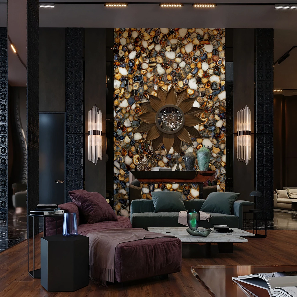 • Mix Agate Wall Panels and Backsplashes: Agate wall panels and backsplashes serve as captivating focal points, transforming ordinary walls into works of art. Agate tiles or slabs can be used as backsplashes in kitchens or bathrooms. Their unique patterns can add a luxurious and artistic touch to these spaces.